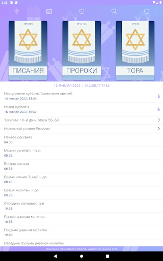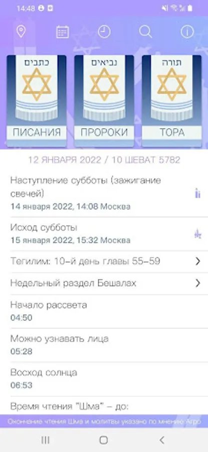 The Tanakh application allows you to leave bookmarks and your own comments. Jewish calendar with automatic determination of the current weekly chapter and main astronomical times (sunrise and sunset, start and end of the Shema and prayer) based on the user's location.
