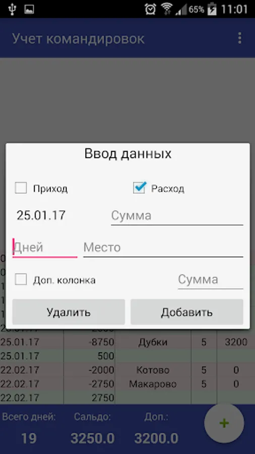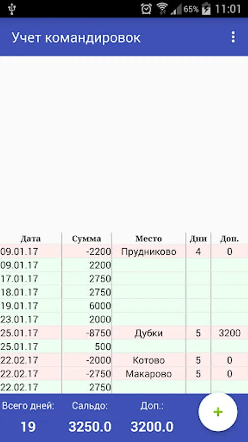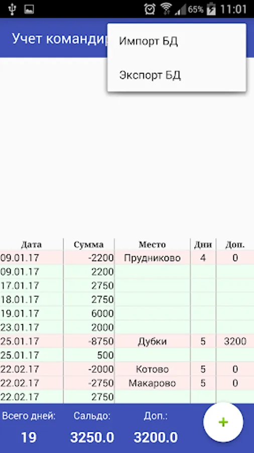 The app allows you to keep a record of the days spent in business trips, monitor payments to the employer, to count any concomitant amount (in column "More" can be recorded, for example, the cost of food and other needs, or other income and expenses).