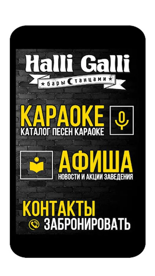 Brand mobile application to a karaoke bar "Halli Galli", which you will find: