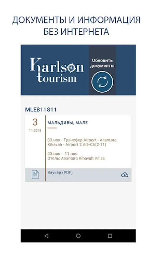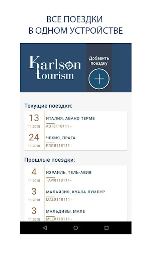 All the necessary documents for traveling in one application, on one device! Forget about printing tickets, vouchers and insurances. Now all the documents for vouchers issued by the tour operator “Carlson Tourism” will be loaded into the KTraveler application. It is enough to scan the QR code assigned to the application by the tour operator “Carlson Tourism”, and all documents will be instantly downloaded to your phone or tablet! To travel around the world you need only two items - a passport and a mobile device!