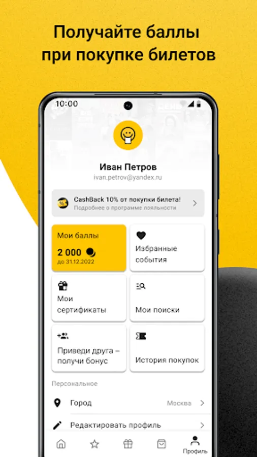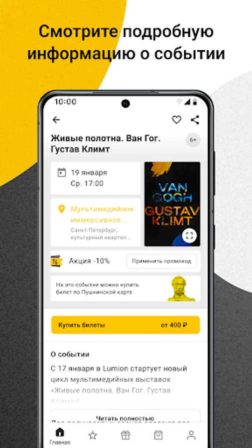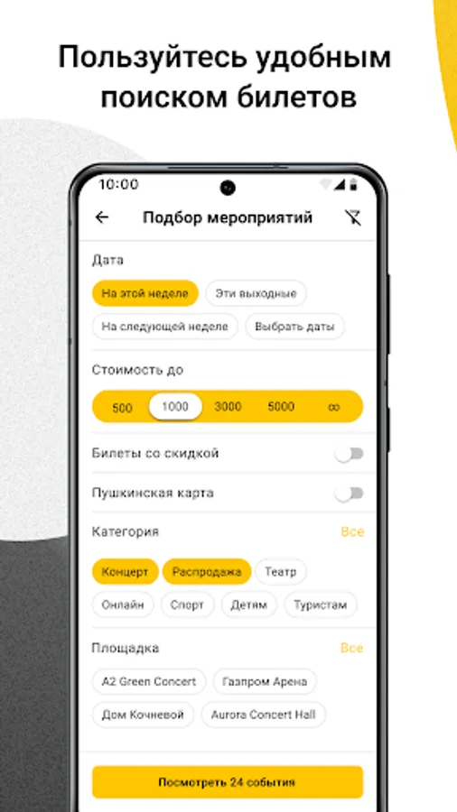 Concerts, musicals, performances, dramas and comedies, ballets and operas, New Year's performances, exhibitions, festivals, clubs, matches - full integration of the application with the Kassir.Ru website allows you to receive up-to-date information on all the repertoires you are interested in.