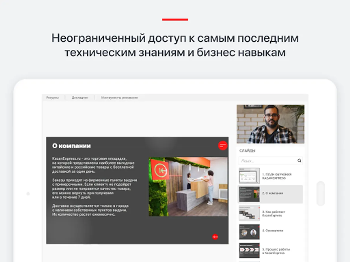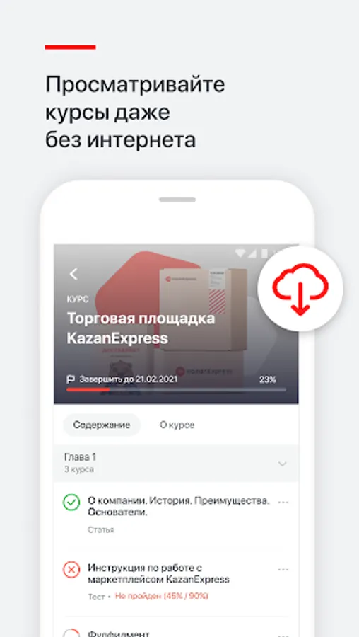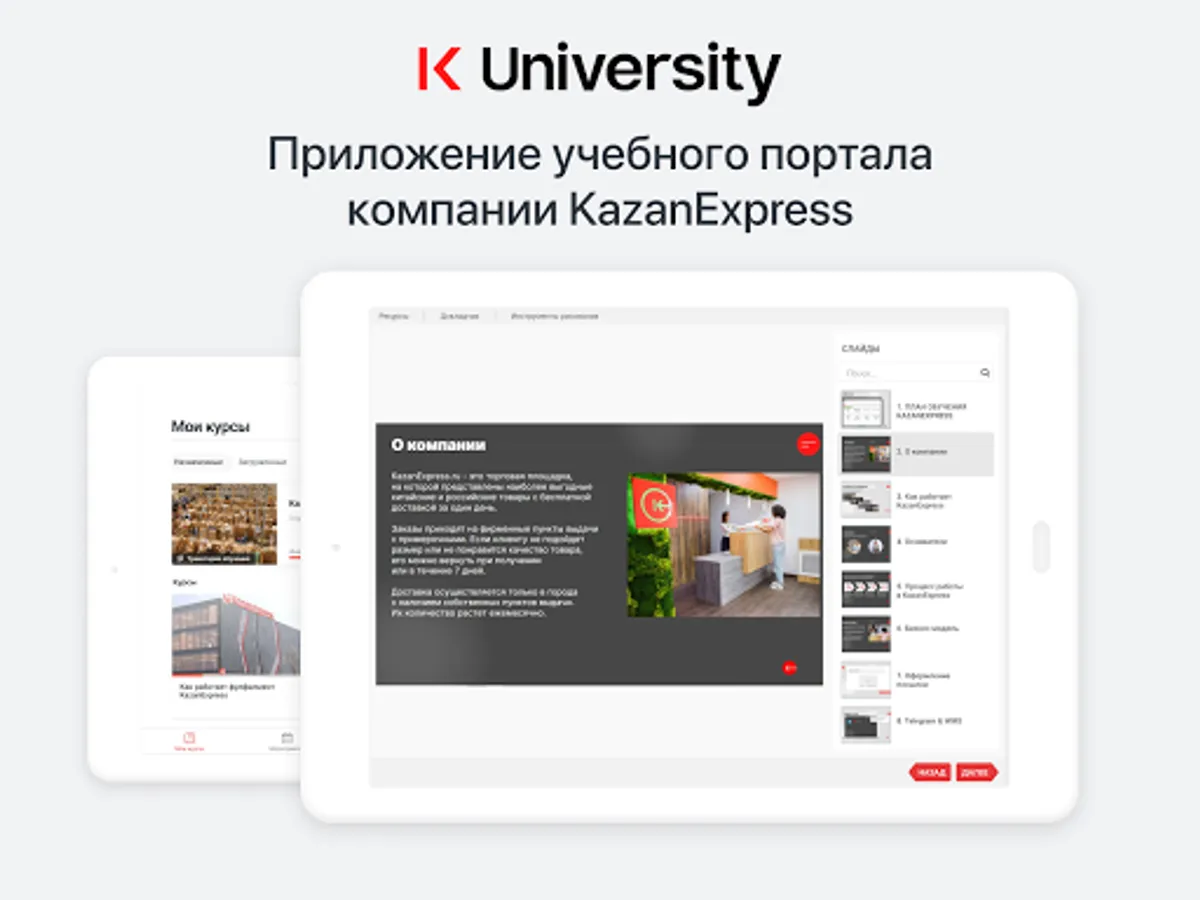 KazanExpress University Corporate University is a platform for training KazanExpress employees. The application allows you to immerse yourself in knowledge at any time, in any suitable place. Simple and easy-to-use distance learning app has a modern intuitive interface. KazanExpress University will allow: