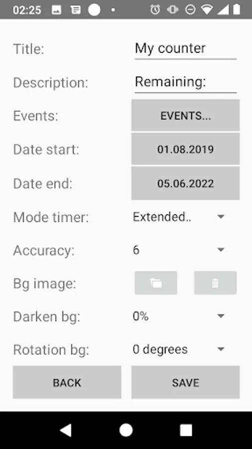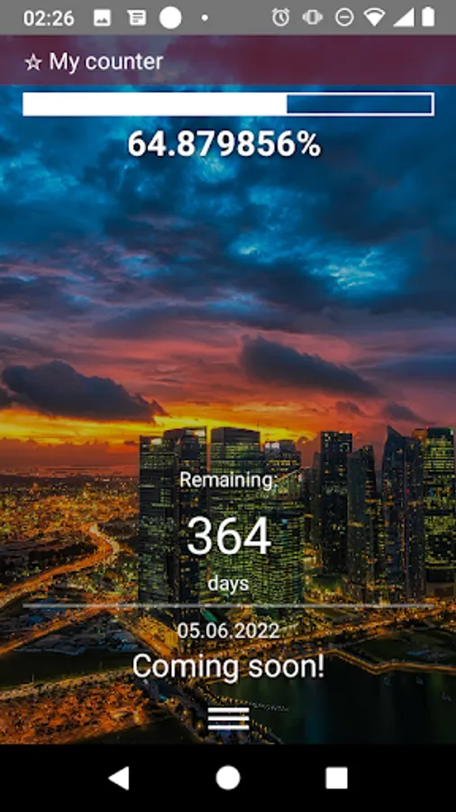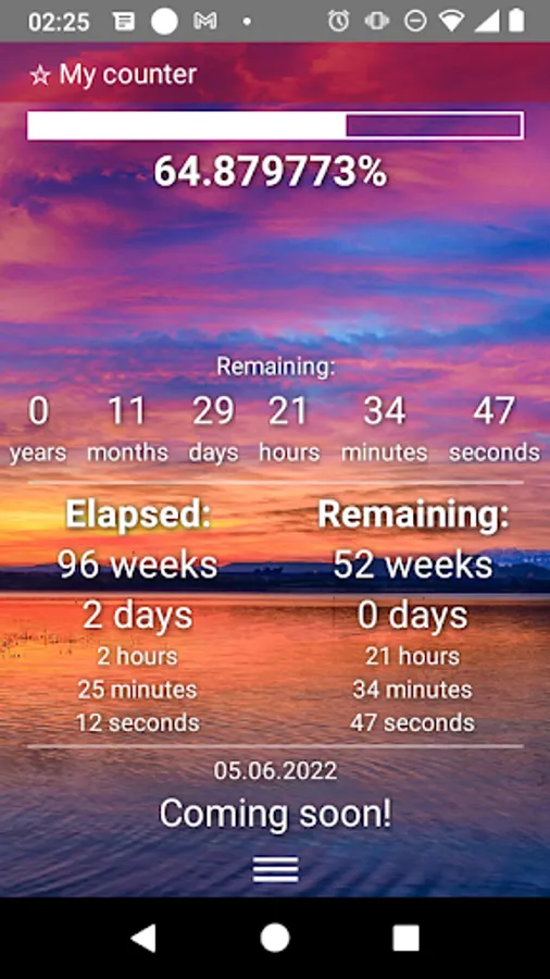 DMB Counter: countdown timer days. Simple and easy counter that shows how many percent of the start date of the back and how much is left before the event in years, months, days, hours, minutes and seconds. To start the timer, you just need to specify the start date and end date.