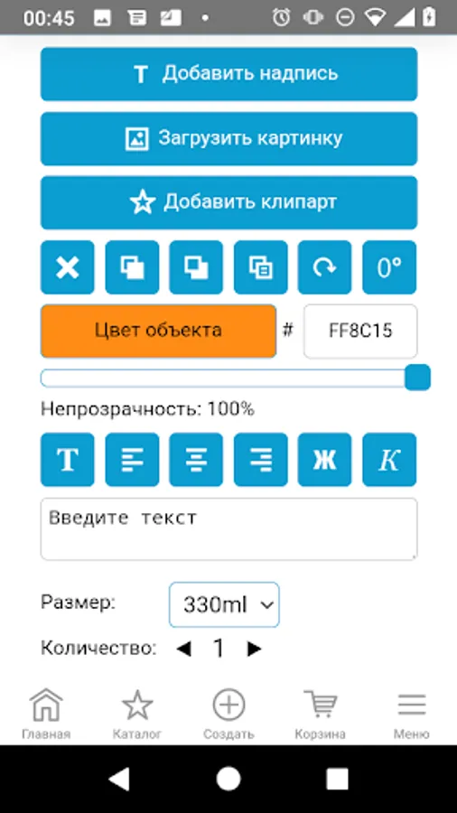 Loading pictures and photos, vector clipart, adding labels in different colors and fonts, moving objects, resizing, rotating. A 3D preview has been implemented for mugs and cups, allowing you to evaluate the design of a souvenir close to real