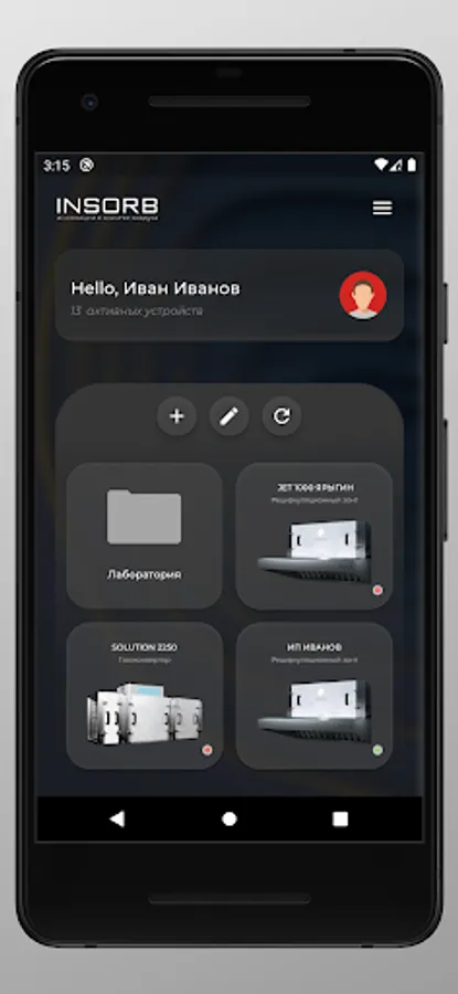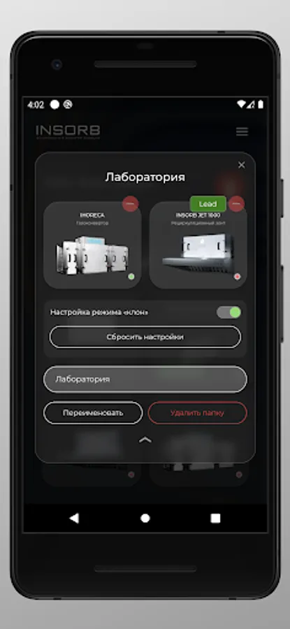 Application for INSORB customers, with which they can remotely monitor and control purchased equipment and receive operational technical support for the selected device.