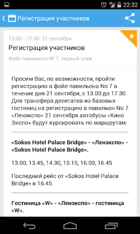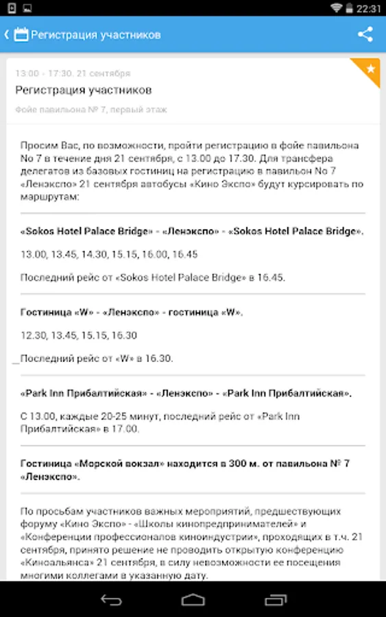 The app gives you a unique opportunity to immediately review any changes in the schedule of presentations and business programs - time and venue, the emergence of new activities.