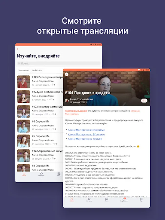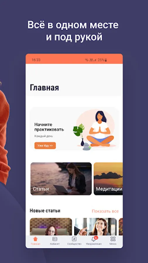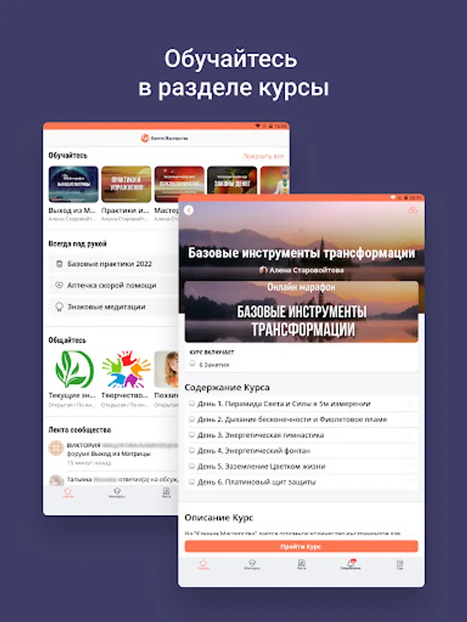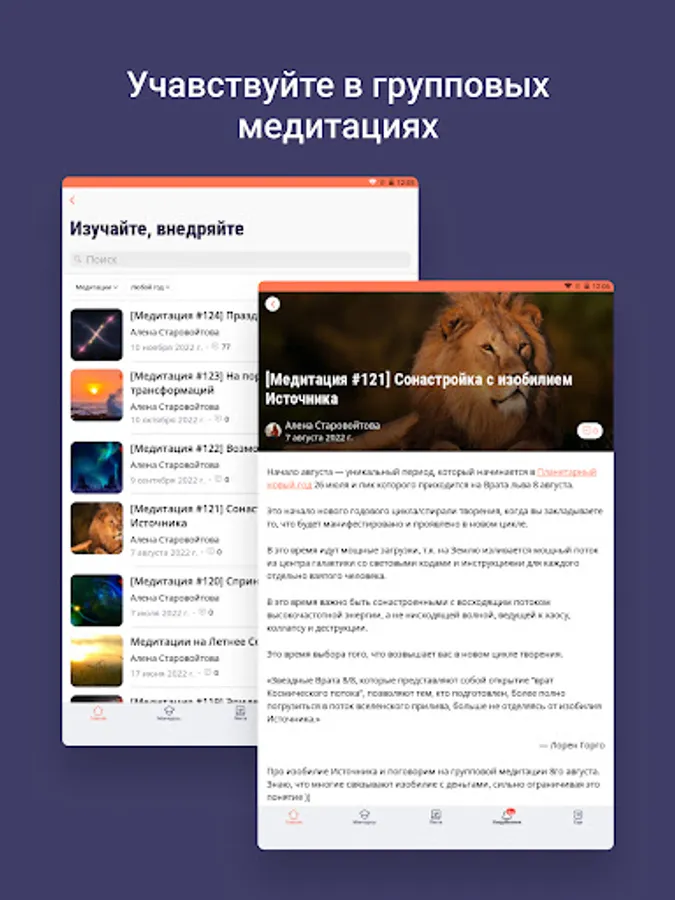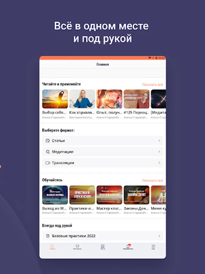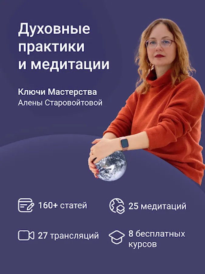 Inside the application are articles, meditations, recordings of Alena Starovoitova's broadcasts, free introductory courses, as well as a community of like-minded people.
