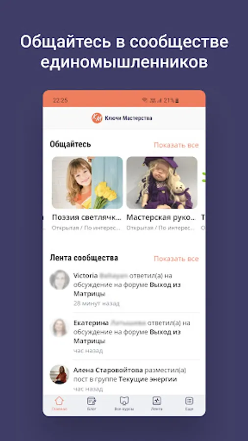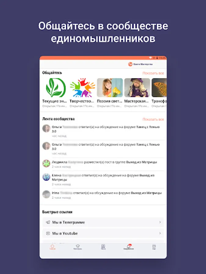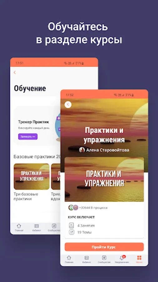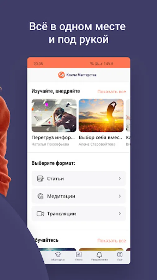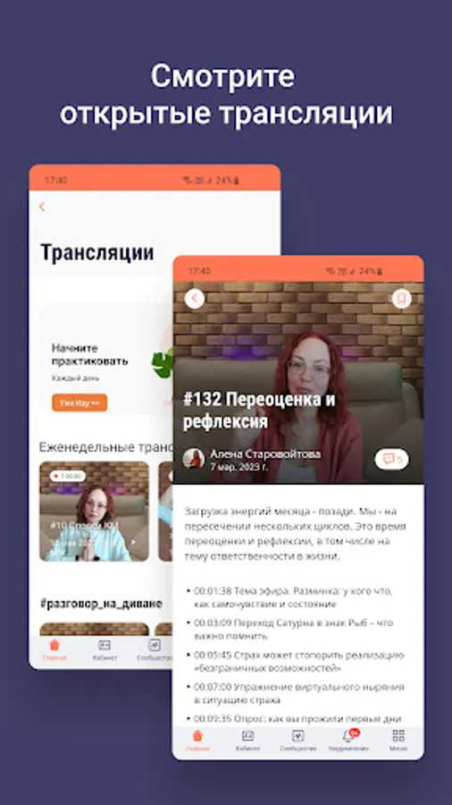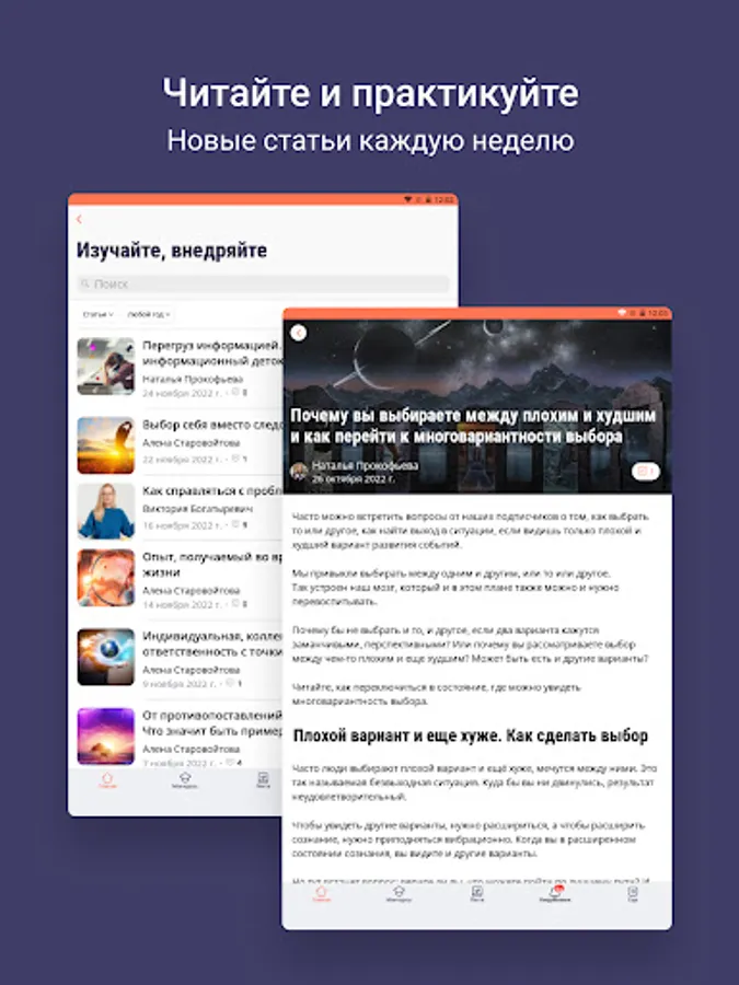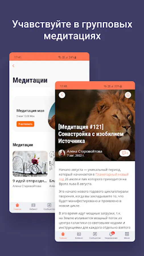 Inside the application are articles, meditations, recordings of Alena Starovoitova's broadcasts, free introductory courses, as well as a community of like-minded people.
