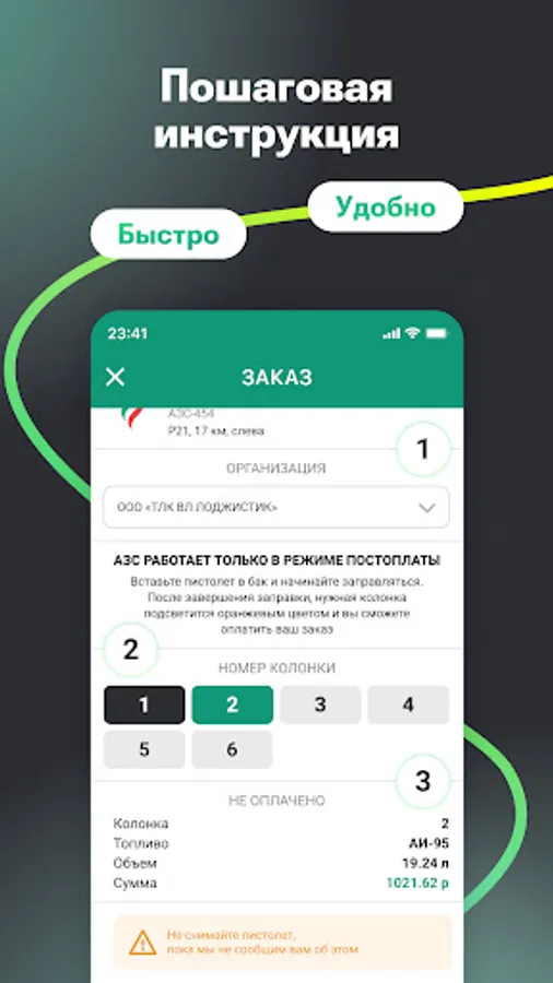• Save time - instant connection of drivers, driver's smartphone instead of a fuel card with payment from the application