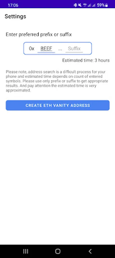 With ETH Vanitor you can create Ethereum address with desired prefix/suffix - just enter what you want and press 'Start'. Note address search is a difficult process: it depends on processing power of your device and count of entered symbols. If you choose short prefix or suffix search will finishing faster. After successful generation you will get a mnemonic of new address with your parameters.