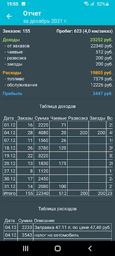 - Accounting for gas stations and repair costs, fines, insurance, etc.