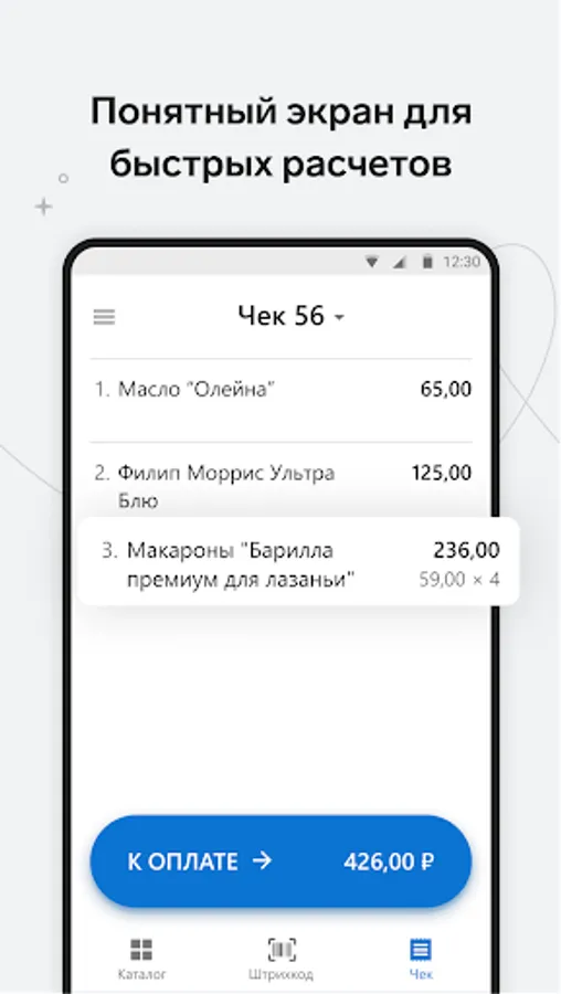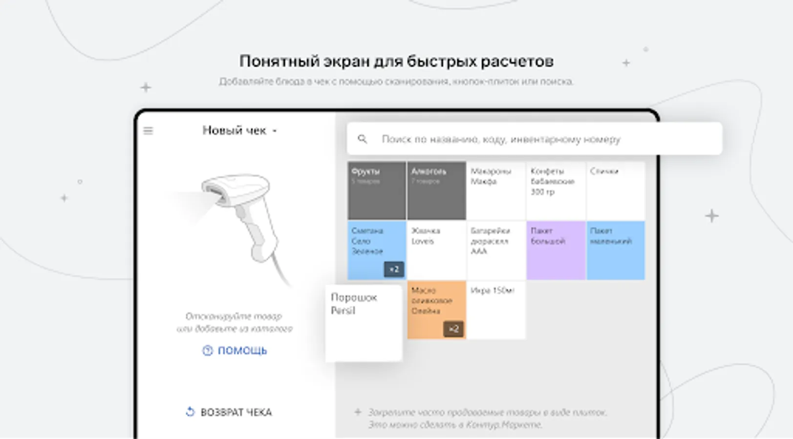 Add items to the receipt in any convenient way: using the tile buttons on the screen, scanning a barcode, searching in the catalog.