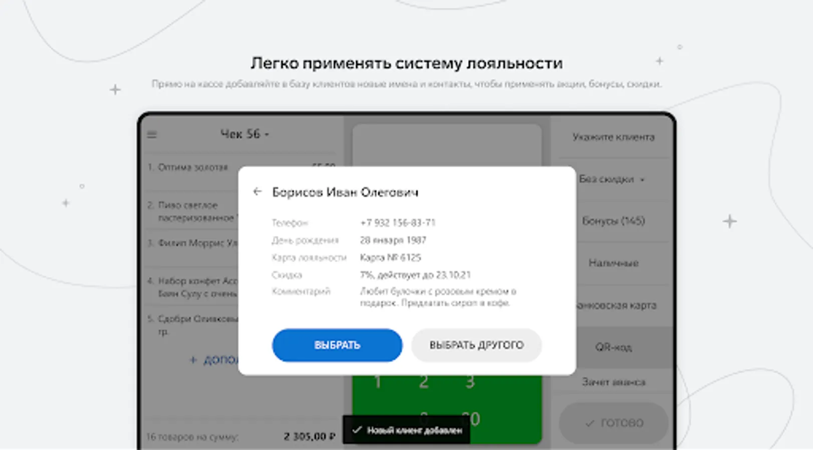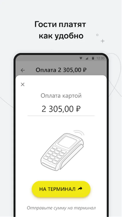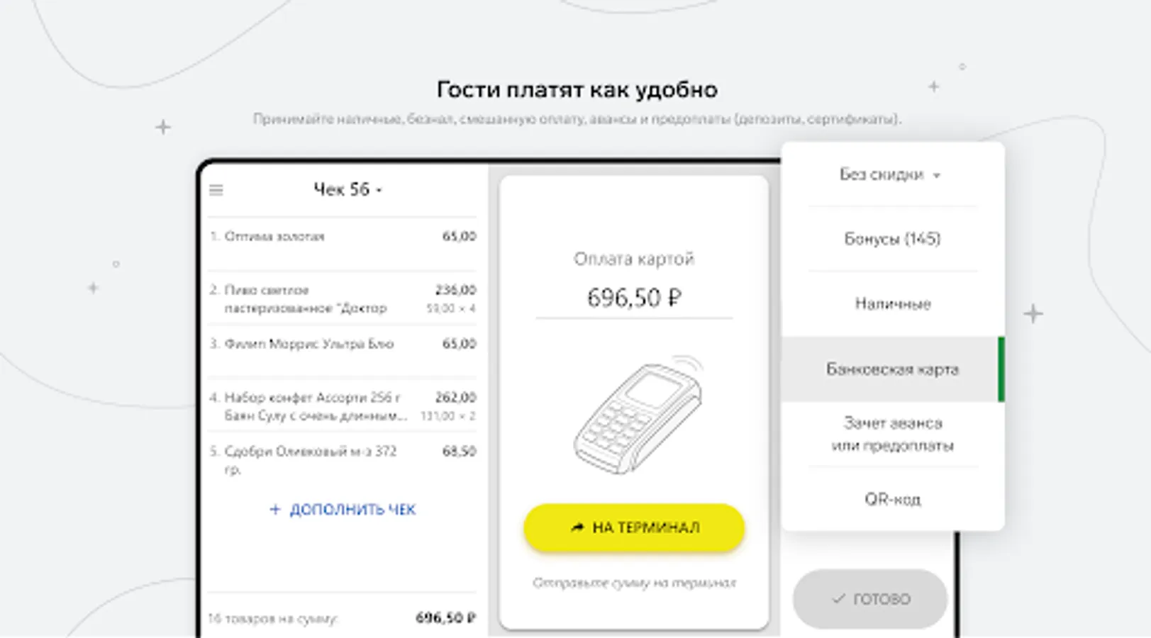 Accept payments in cash and non-cash, mixed payments, by certificate or deposit (upfront and prepayment), as well as by QR code through the SBP fast payment system (if Tinkoff has a cash register). Generate sales and return checks, pending checks and correction checks. Apply discounts to the entire check or a specific item.