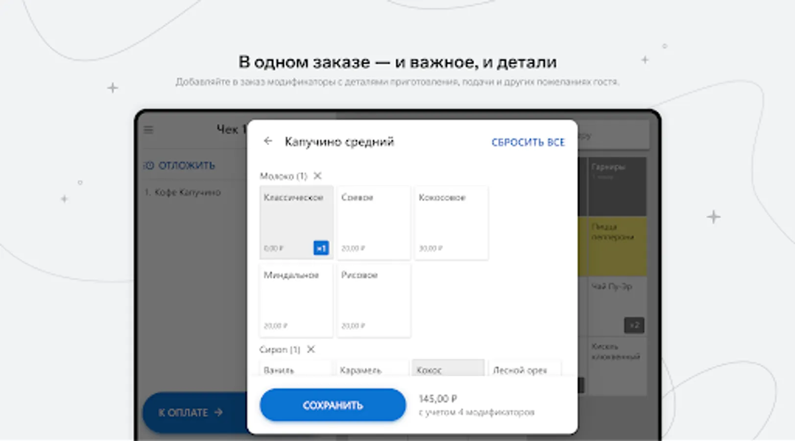 Add modifiers to the order and send it to printers installed in different kitchen workshops.