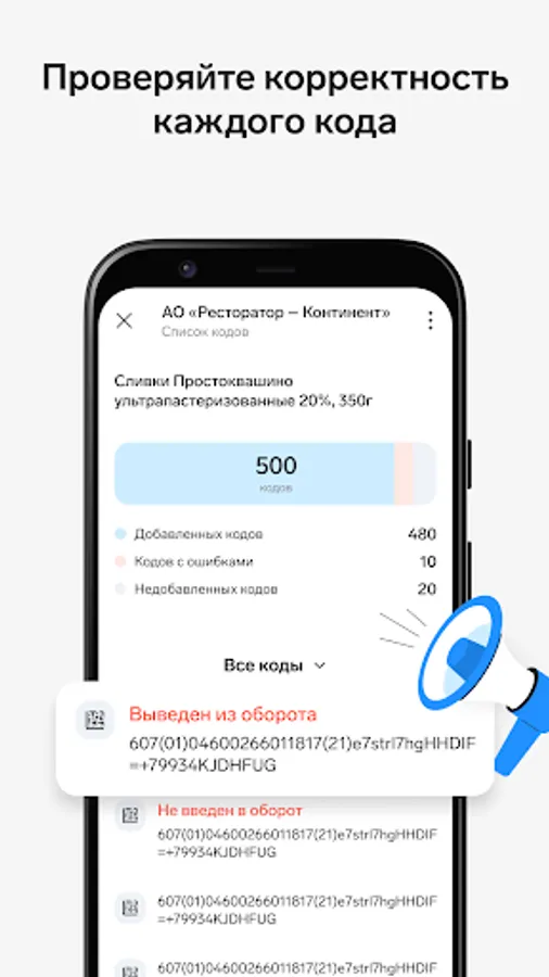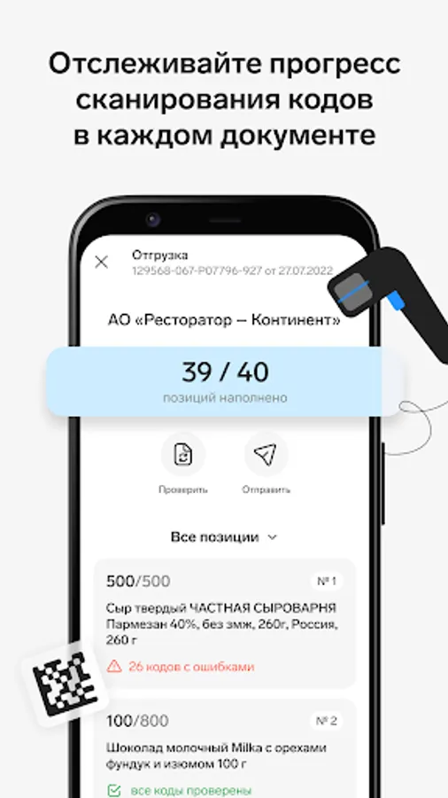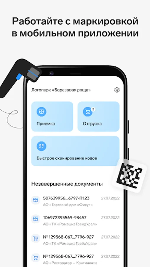 The application makes it possible to receive, ship and quickly check marking codes using a smartphone camera. And the work on the TSD makes it faster and more convenient.