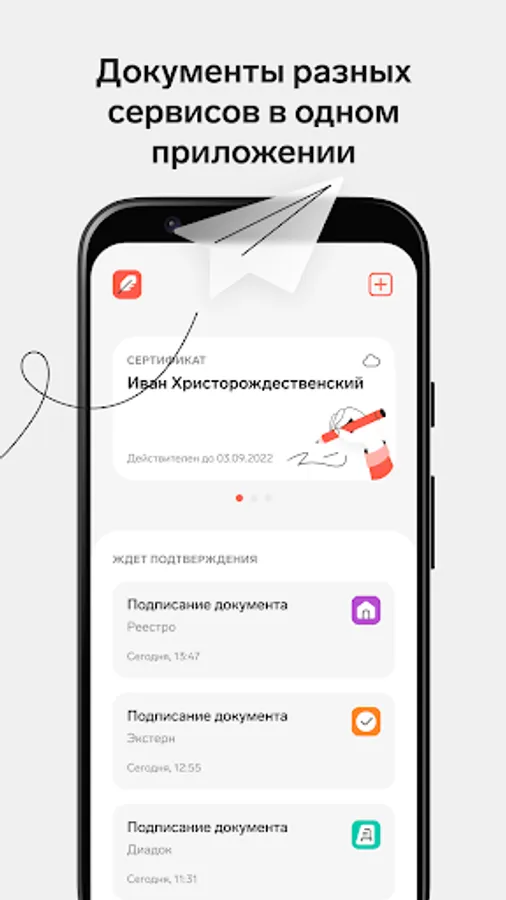 Work with electronic signature certificates through the application, not through a computer with a token. Add one or more certificates to the application using a QR code and name them as you wish.