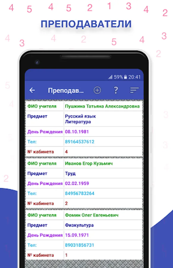 • Add information about the instructors (name, birthday, phone number, subject and room number);