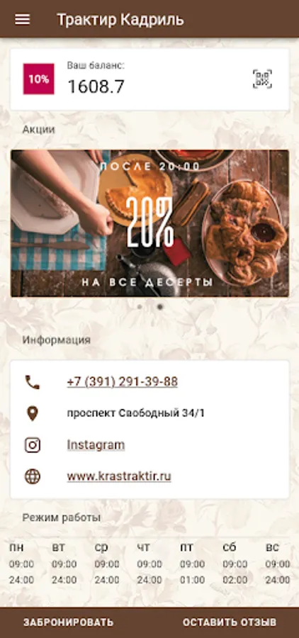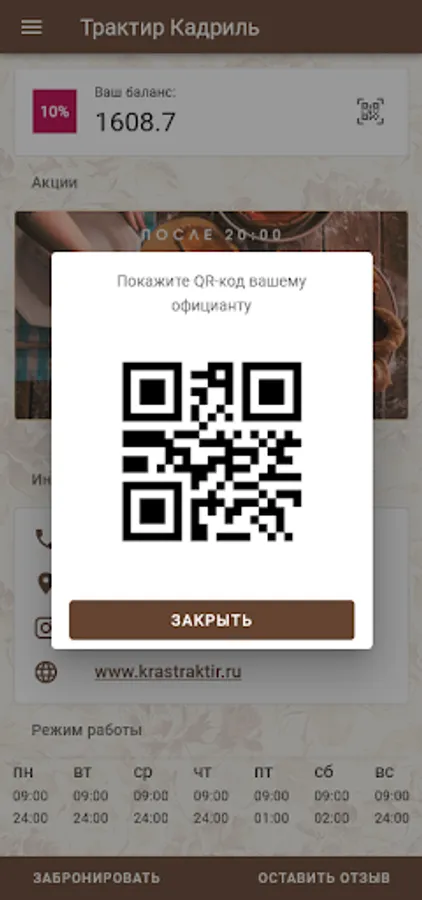 Using the Traktir Kadril mobile application, you can find out the balance of bonuses on your account, accrue or write off bonuses when ordering at the Traktir Kadril restaurant. One bonus is equal to one ruble.