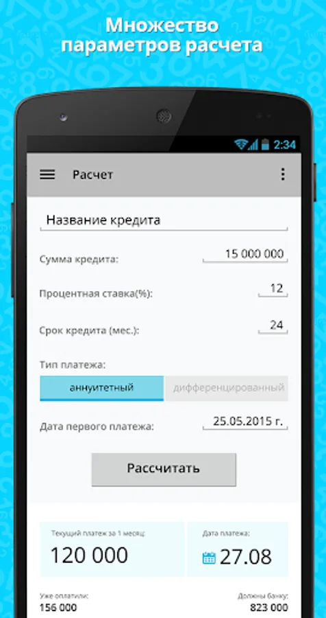 - Calculation of mortgages and loans (type of payments - differentiated and annuity)
