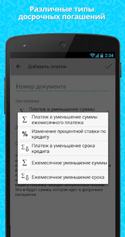 To calculate a loan that needs to be repaid early, you need to enter the amount and date of possible early repayment, specify the type of early repayment