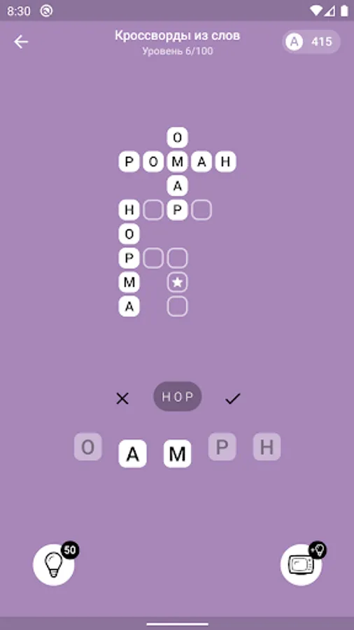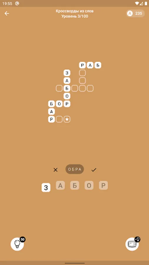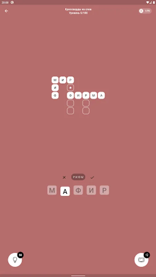 Word Crosswords - this mode is similar to a regular crossword, but here you do not need to answer questions, you just need to guess the words (a bit like the Scrabble game), collecting as many stars as possible per level. The more stars - the higher the reward in the form of coins. There are 100 crossword puzzles available.