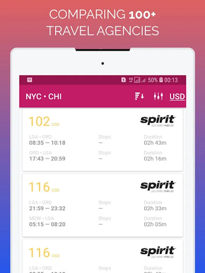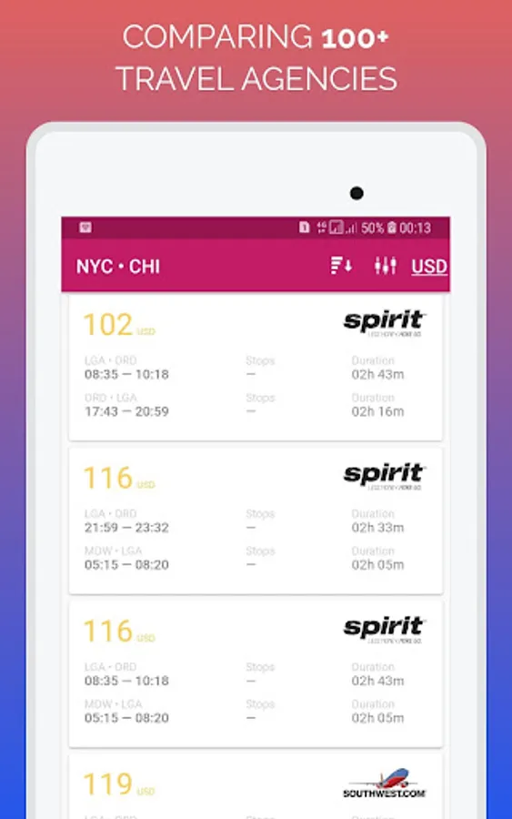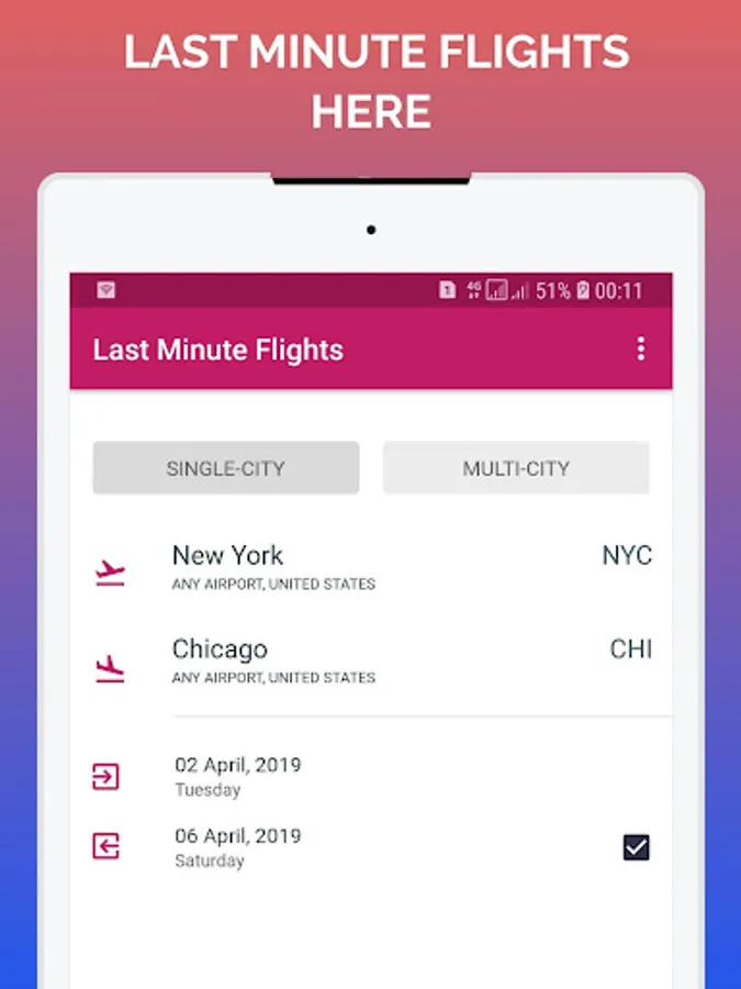 Last minute flight deal app is designed to help you compare flights quickly and find unbeatable deals from Emirates, Qatar Airways, Singapore Airlines, Cathay Pacific, ANAs, Etihad Airways, Turkish Airlines, EVA Air, Qantas Airways, Lufthansa, Garuda Indonesia, Hainan Airlines, Thai Airways, Air France, Swiss Int'l Air Lines, Asiana Airlines, Air New Zealand, Virgin Australia, Austrian, Bangkok Airways, Japan Airlines, Dragonair, AirAsia, KLM, Virgin America, British Airways, Finnair, Virgin Atlantic, Hong Kong Airlines, Norwegian, Air Canada, China Southern, Aegean Airlines, Malaysia Airlines, Delta Air Lines, Korean Air, China Airlines, easyJet, SilkAir, Aeroflot, South African Airways, Oman Air, Air Astana, Vietnam Airlines, Google Flights, LAN Airlines, Jetstar Airways, Porter Airlines, AirAsiaX, Aer Lingus, WestJet, Indigo, Iberia, jetBlue Airways, Jetstar Asia, Azul Airlines, Avianca, TAM Airlines, Alitalia, Brussels Airlines, Expedia App, Alaska Airlines, Scoot, SAS Scandinavian, Air Seychelles, TAP Air Portugal, Thomson Airways, Google Trips, Southwest Airlines, SriLankan Airlines, United Airlines, Copa Airlines, Azerbaijan Airlines, Jet Airways, Hawaiian Airlines, Air Mauritius, Air Berlin, Eurowings, Ethiopian Airlines, American Airlines. Whether you're looking for domestic flights, international flights or last minute deals.
