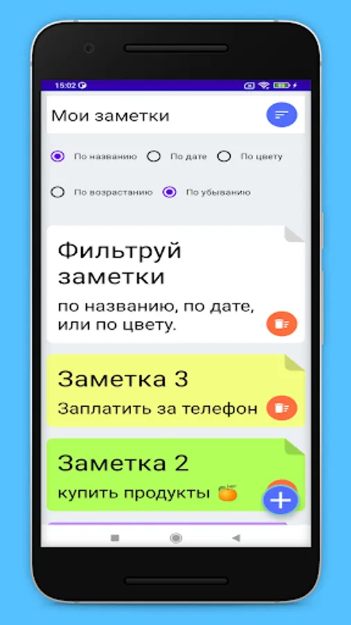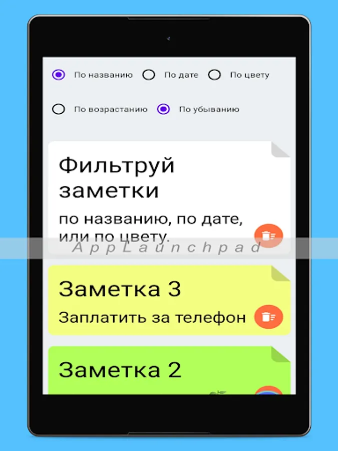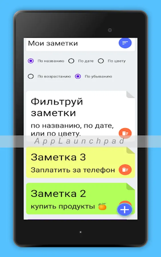 Add different notes, choose note color, filter notes by title, date or color.