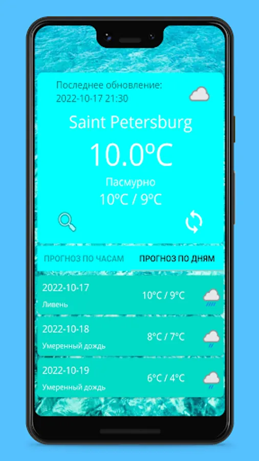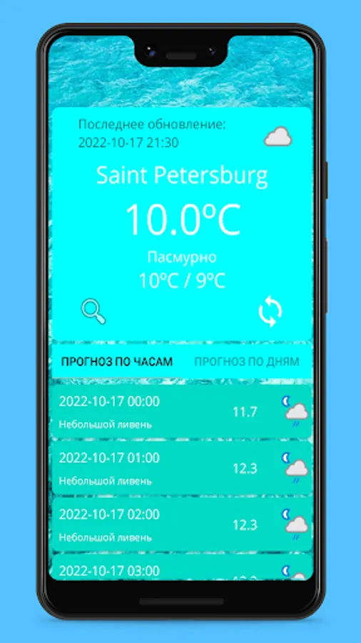 Simple weather forecast, broken down by hours and days (for today and two days ahead). The application determines the geolocation and issues a forecast, you can use the search bar (you need to enter the name of the city only in English letters).