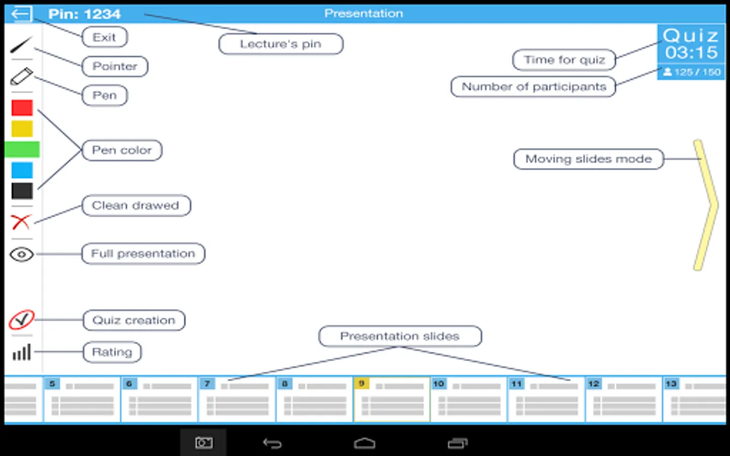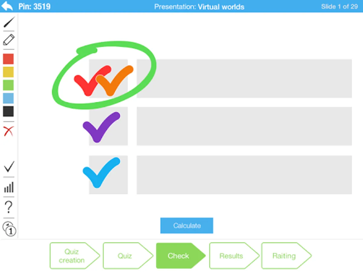 The teacher asks a question about the slide on a projector, and students mark their answers on the same slide on their devices. Then, the teacher encircles the correct answers using his tablet or smartphone. After that, the app analyzes the results and creates a student rating that can be transferred back to the projector or to the personal device.
