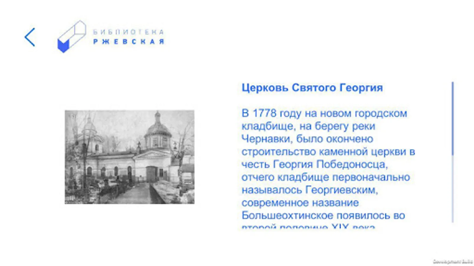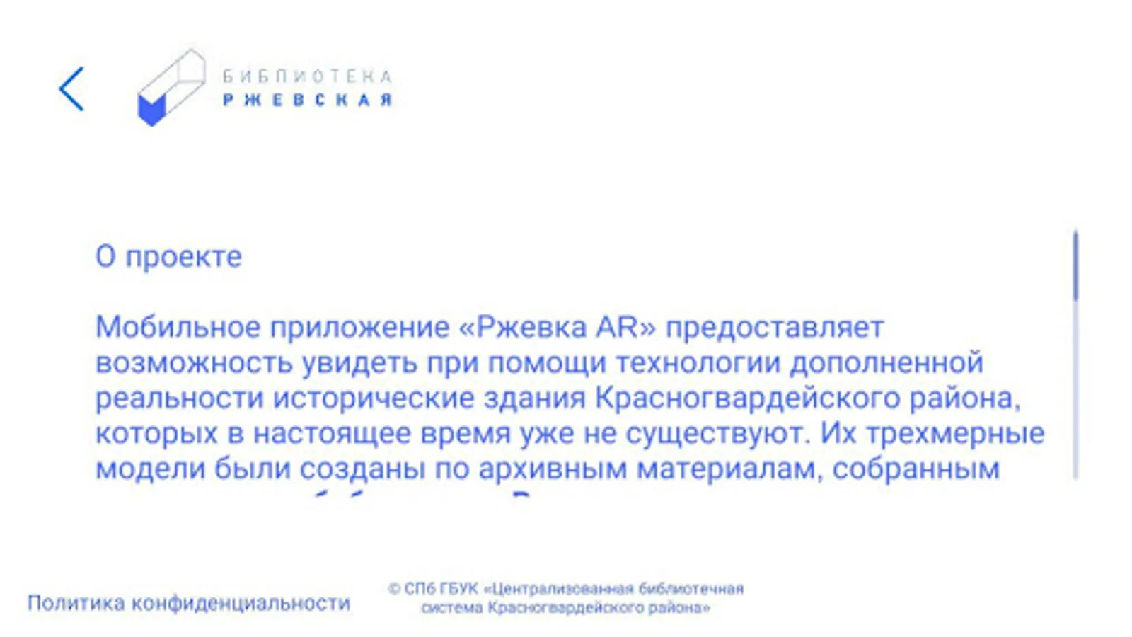 The Rzhevka AR mobile application provides the opportunity to see the historical buildings of the Krasnogvardeisky district, which currently no longer exists, using Augmented Reality technology. Their three-dimensional models were created based on archival materials collected by the staff of the Rzhevskaya library.