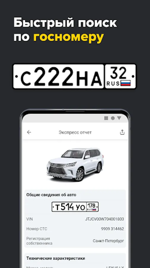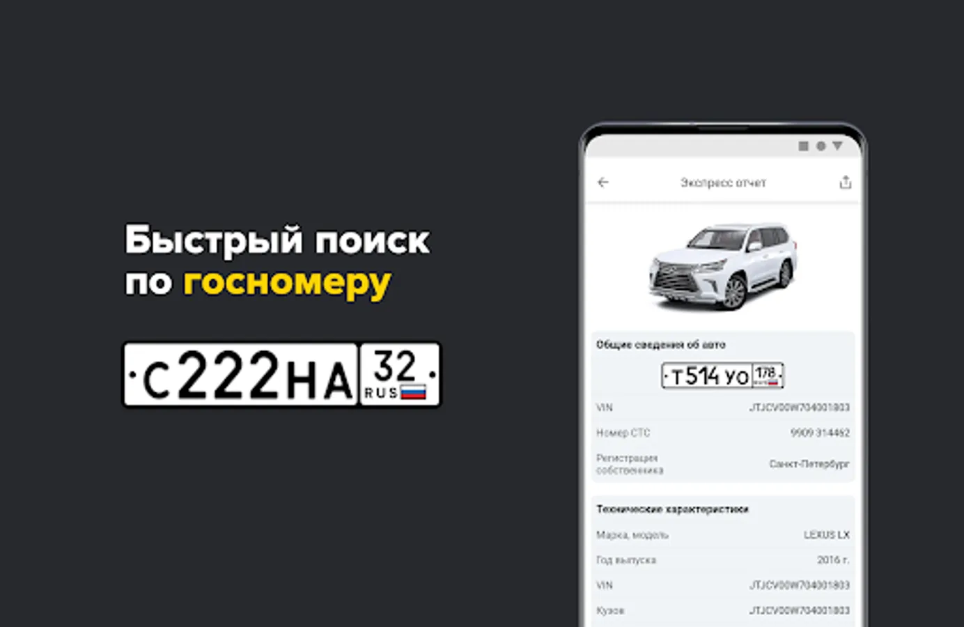 - the application works for cars of all brands (Mercedes, Renault, VAZ, Volkswagen, BMW, Kia, Audi, etc.) registered only in the traffic police of Russia