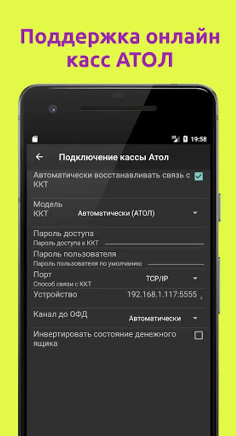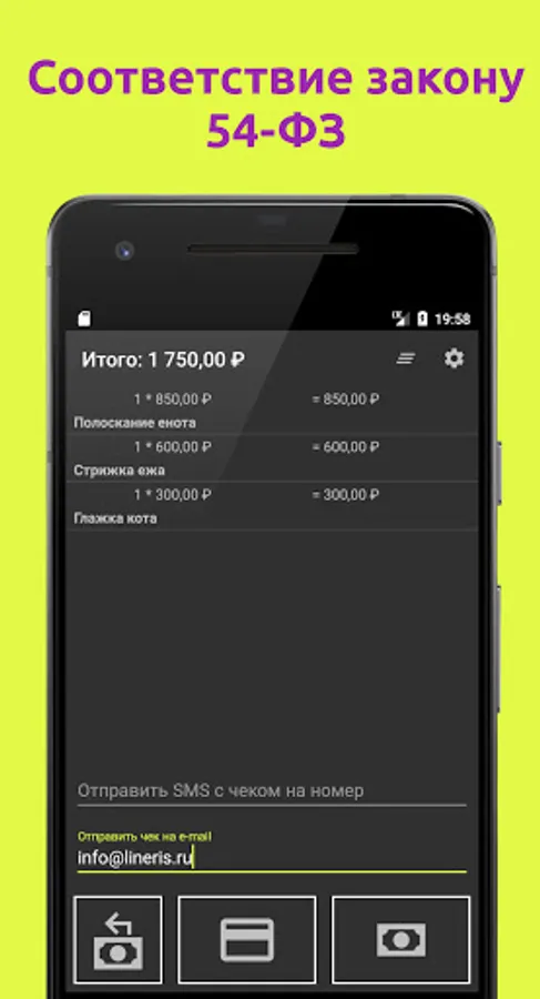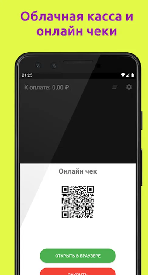 The check is generated in full accordance with the law of the Russian Federation "On the use of cash registers" 54-FZ at cloud or hardware cash desks Atol.