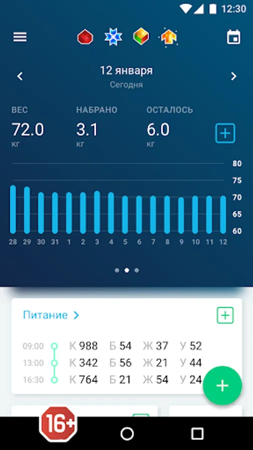 The Nutrition Diary and Calorie Counter was created for convenient calculation of calorie norms, KBJU norms (Calories, Proteins, Fats, Carbohydrates), taking into account your goals, activity and for setting proper nutrition. The app has a diet plan, good nutrition recipes and diets. Each diet is adapted to the purpose and diets.