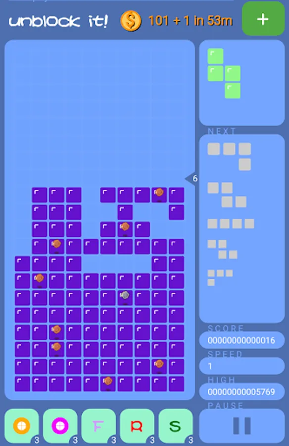 The goal of this tetromino spin-off is to clear the blocks of the evergrowing tower by placing tetrominos over it. Drag the green tetrominos from the right onto the game field and drop it wherever it is best to clear the dark violet blocks. Gold, silver or bronze coins will boost your scores.
