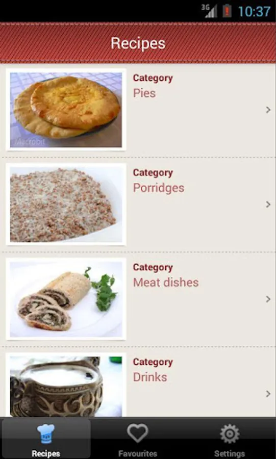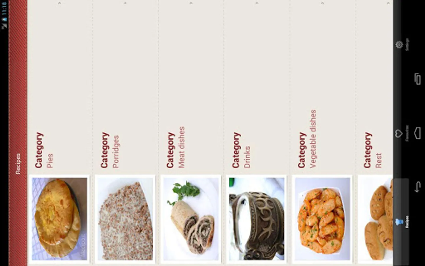 - All recipes are divided into six categories: cakes, meat dishes, vegetable dishes, cereals, beverages, rest. Each category contains a full set of dishes for a quick transition. Each recipe is accompanied by a step by step photo recipe with a detailed description of the process of cooking.
