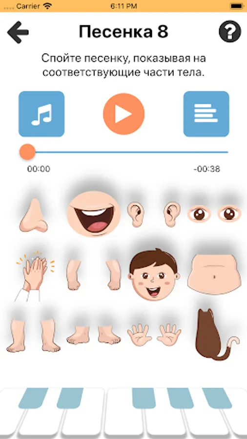 The application contains 62 lessons, this corresponds to approximately one calendar year of study. Each lesson contains a set of workouts, games and songs that children perform with an adult. It is not necessary for an adult to speak English well, because all exercises are voiced and translated! With the help of the Magic Piano lessons, children begin to speak in sentences and come up with their little stories right from the first lesson.