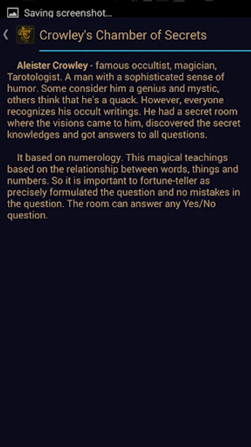 Aleister Crowley - famous occultist, magician, Tarotologist. A man with a sophisticated sense of humor. Some consider him a genius and mystic, others think that he's a quack. However, everyone accept his occult writings. He had a secret room where the visions came to him, discovered the secret knowledges and got answers to all questions.
