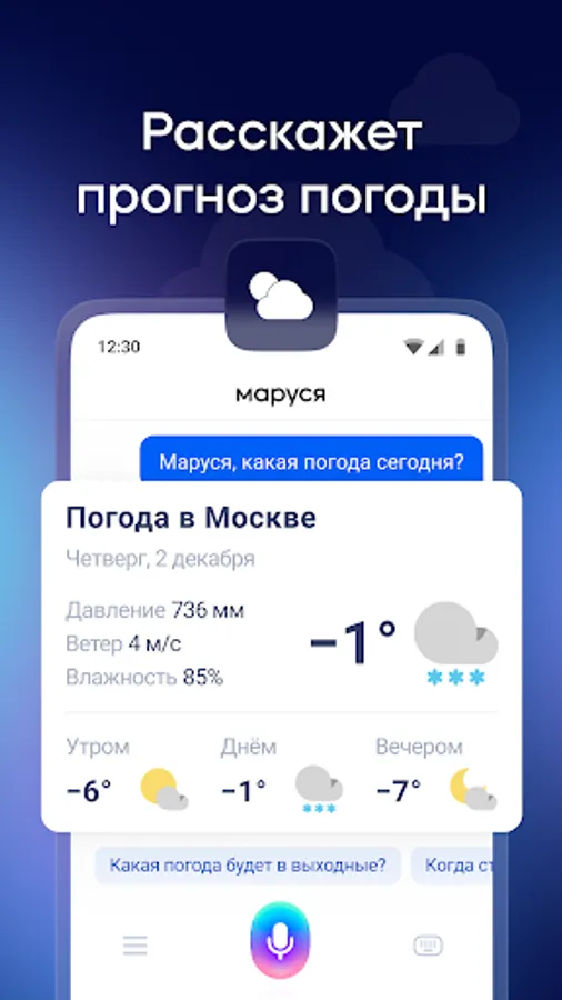 💭 Marusya, what's the weather like? The assistant will tell you the forecast for the day and weekend anywhere in the world. And he will also set an alarm, remind you of your plans, read the news and tell you how long it takes to get to work. Voice control will help you solve everyday tasks faster and easier.