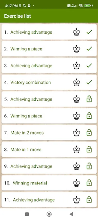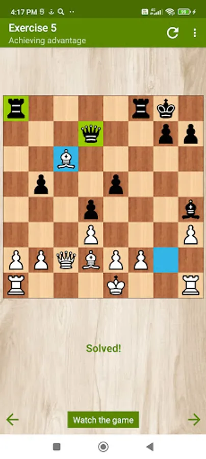 The free version contains 15 interesting puzzles with victory combinations and achieving advantage. After solving each of them, the opportunity opens up to watch the whole chess game, from which the position of the exercise was obtained.
