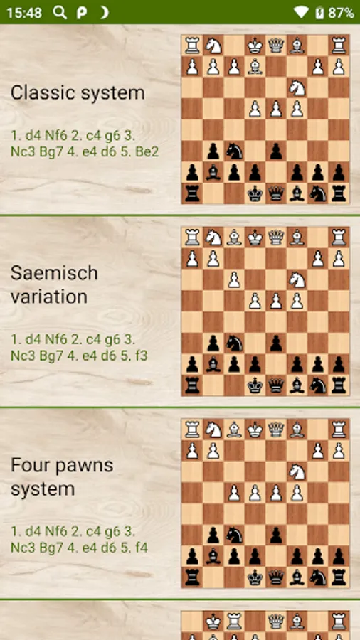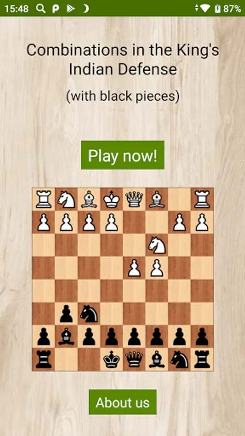 The puzzles are divided into 4 groups according to the main lines of such a popular opening as the King's Indian Defense. In all games of this application, chess players who played with black pieces won.