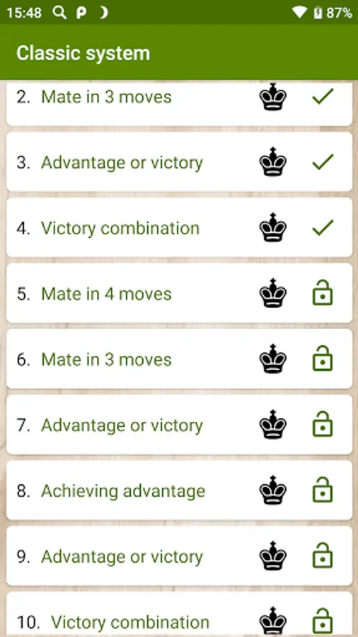 The free version contains 24 interesting puzzles on combinations with victory, achieving advantage and checkmating in several moves.