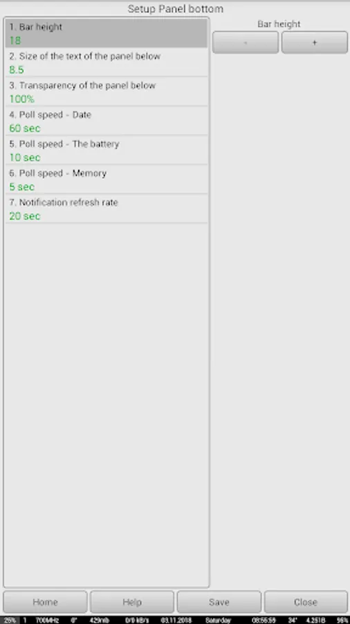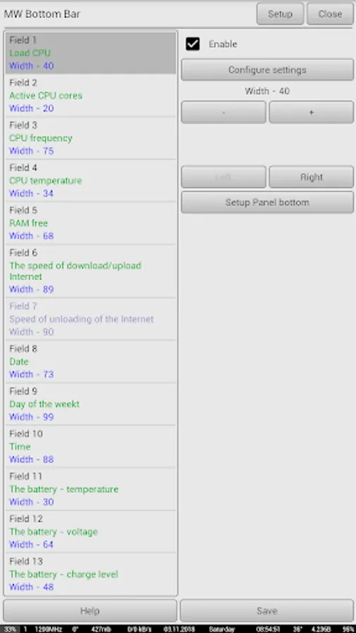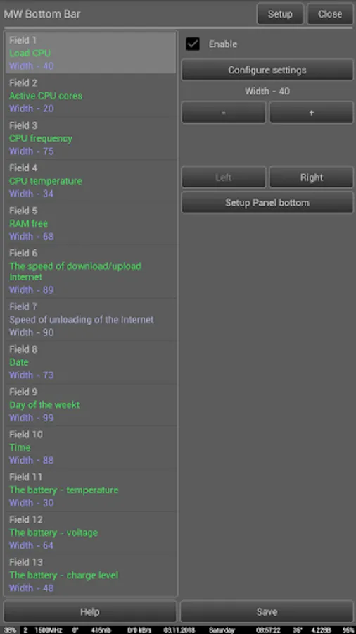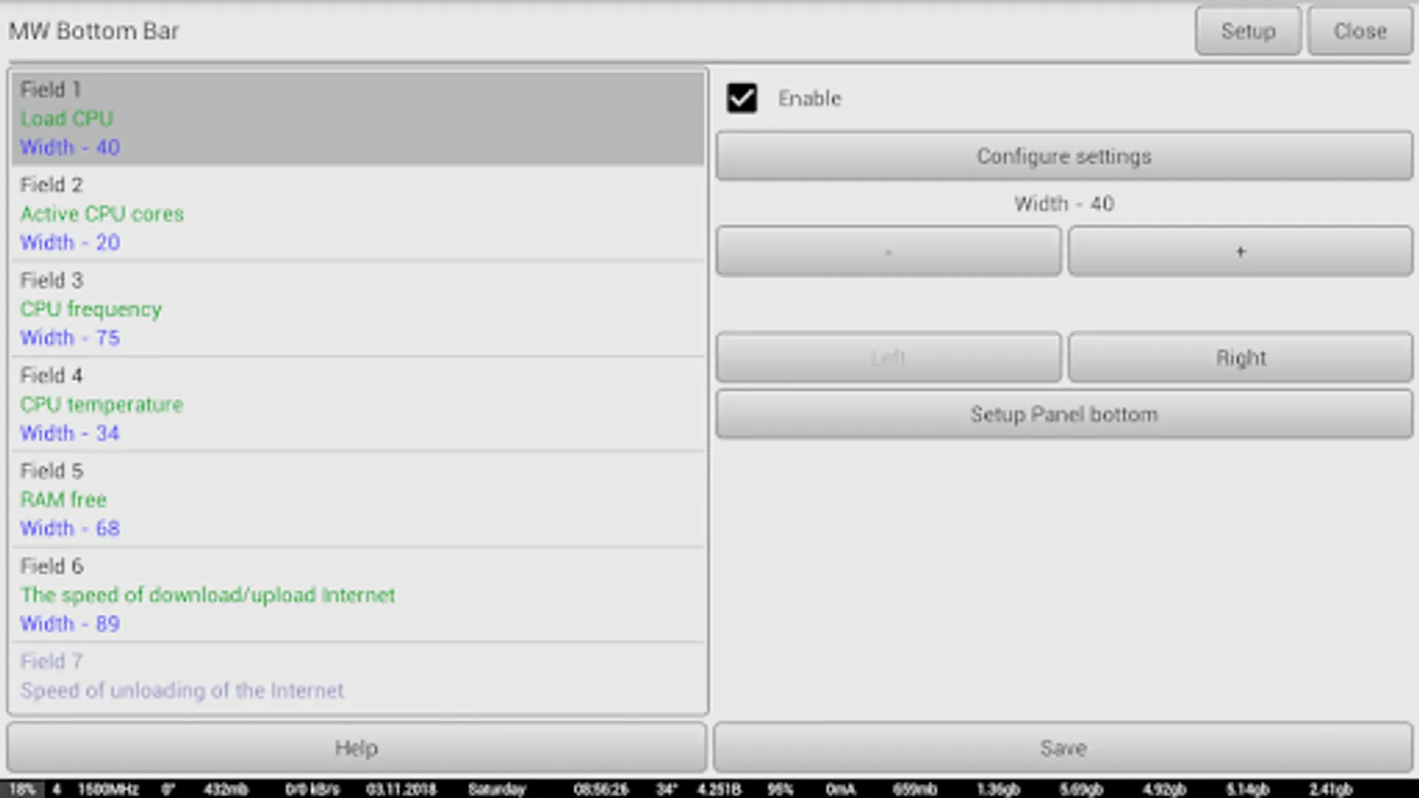 Settings of height of the panel, a font of the displayed information, width of each field, transparency of the panel below are available.