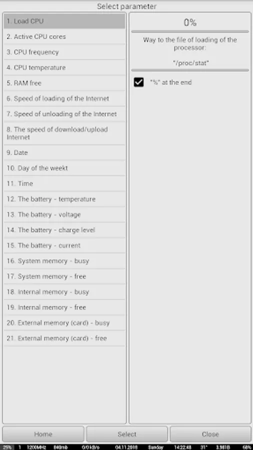 The application shows the status of bars in the bottom of the screen with display of various useful information such as loading of the processor, quantity of the working processor kernels, frequency of operation of the processor, the number of the free RAM, speed of loading and return of the Internet, battery parameters (temperature, tension, charge level), amount of busy and free memory (the complete list is visible on application screenshots).