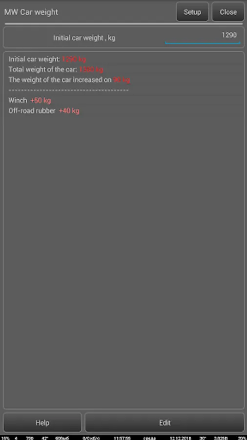 The program allows to set the initial weight of the car and to add the weight of various units added or deleted when tuning the car and to count the total weight of the car