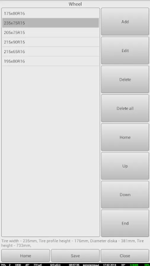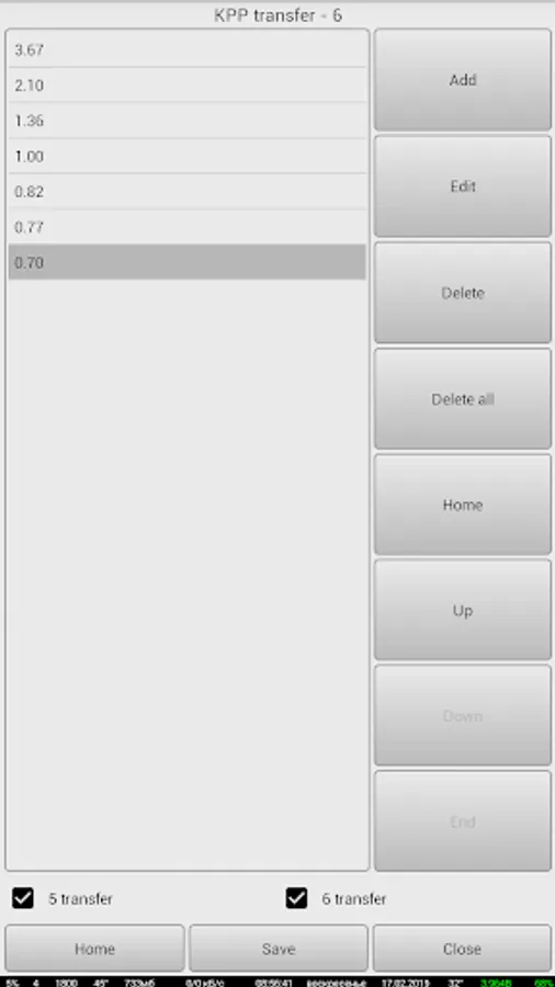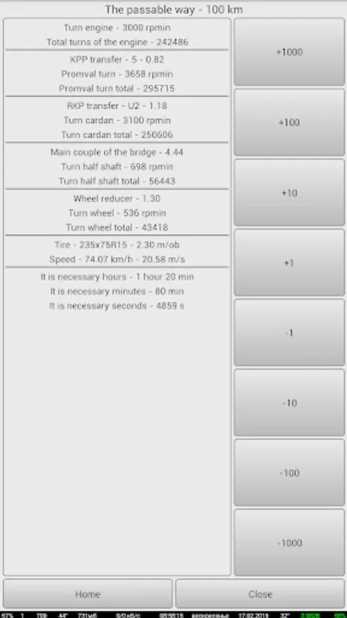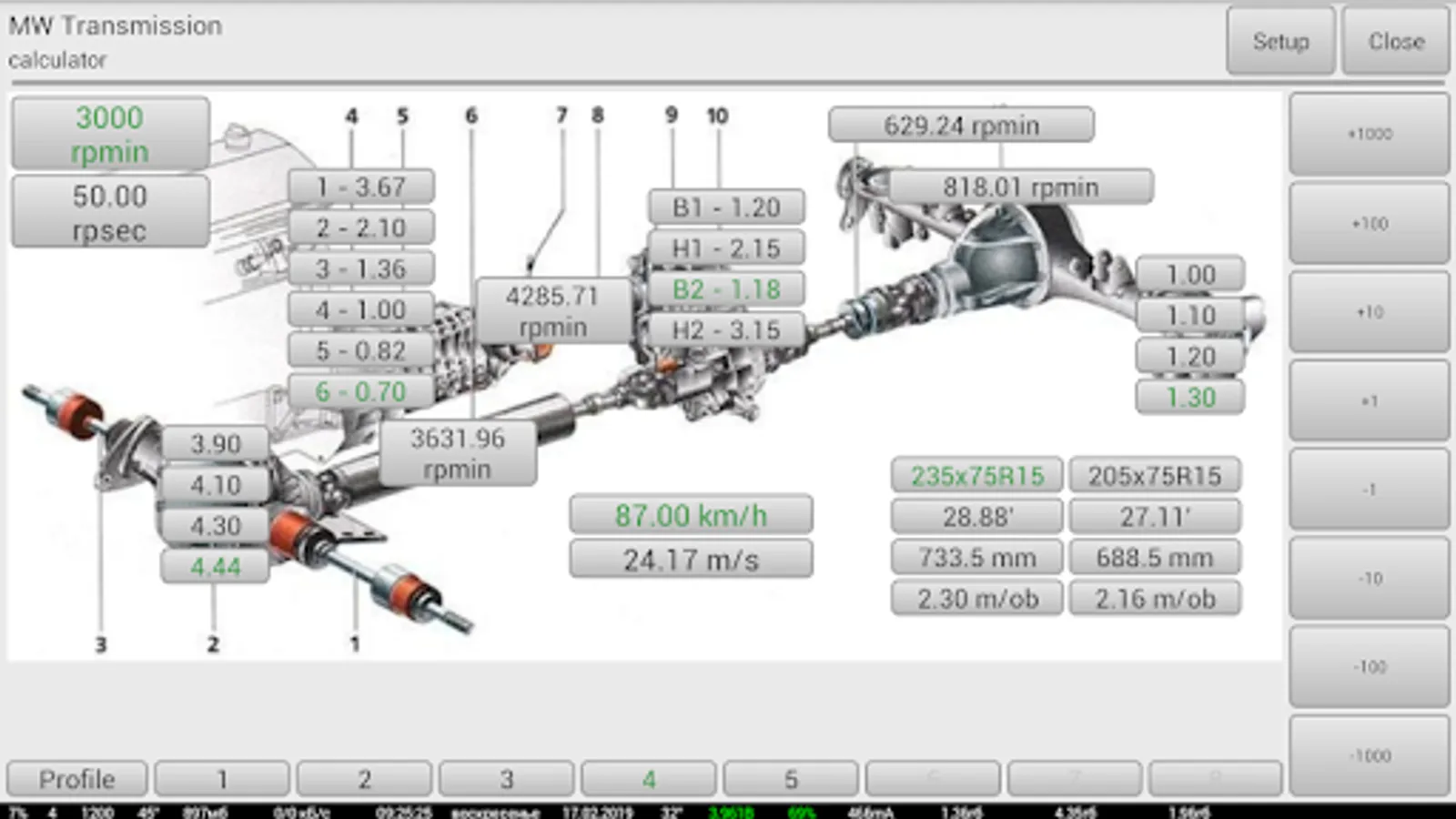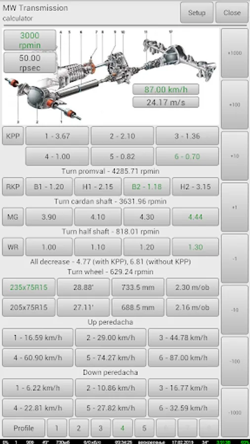The application allows at change of various parameters of transmission (such as engine speed, transfer numbers of a box of gear shifting of the check point, the transfer case of transfers of RCP, the main couple of bridges of GP, transfer number of a wheel reducer of KR, parameters of the used tires) to count change of speed of the car. Also the total transfer number of transmission is displayed.