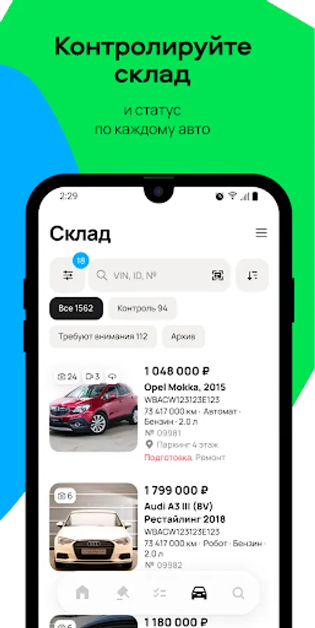 - track the receipt of a car at the warehouse, control the status and rhythm of revaluations;