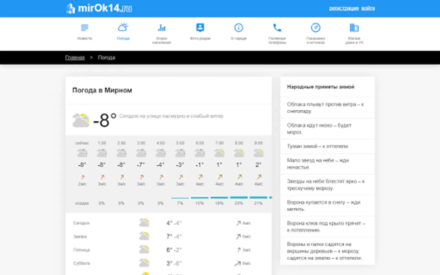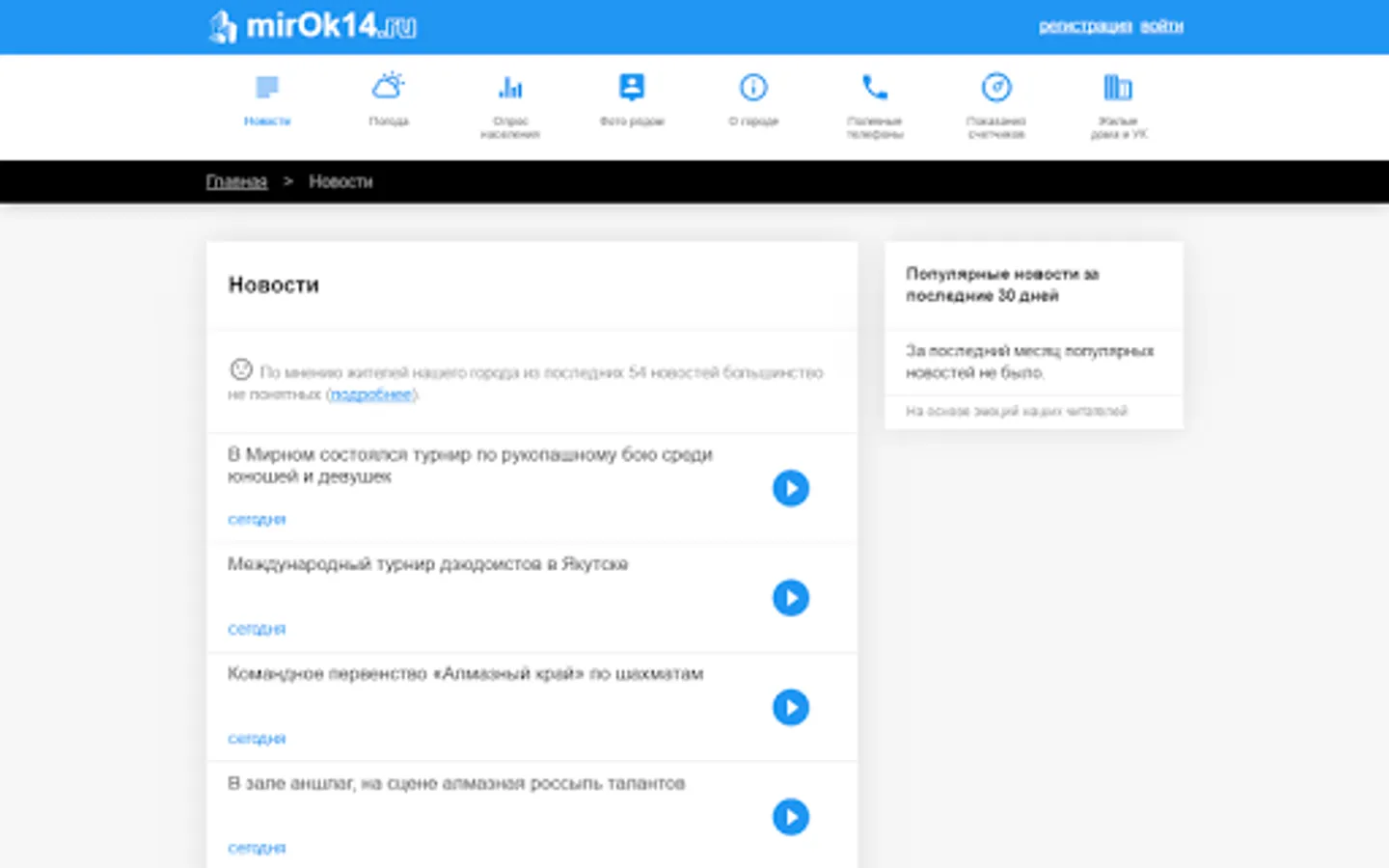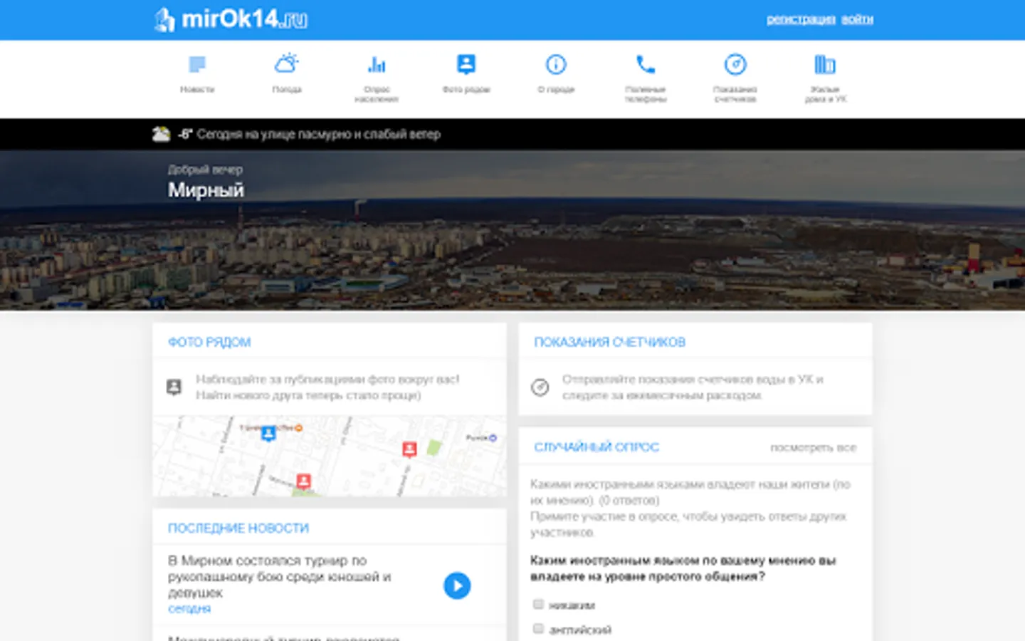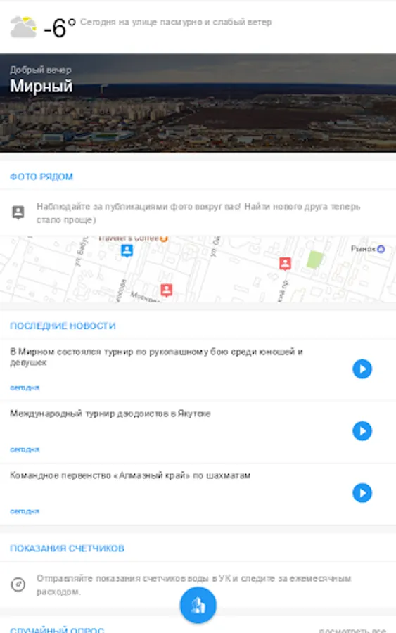 The application for the residents of the city of Mirny. Read the news about the city, to submit indications of counters of water, watch the weather and events. Use an evolving list of online services.