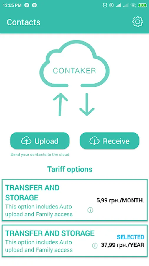 Download and store in the cloud up to 200 contacts for free. To store an unlimited number of contacts in the cloud, you are invited to purchase a subscription for just $ 1 per year. You can subscribe in the Contaker application.