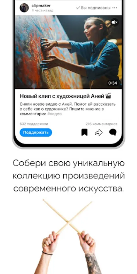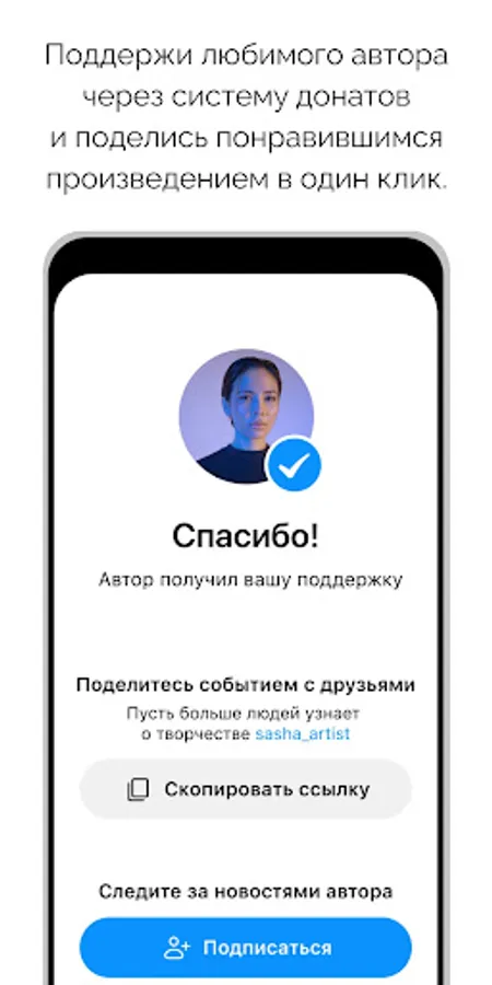 On our platform, art connoisseurs constantly find new Authors for themselves and regularly support talented creators. Each Patron sees a personalized feed of the authors' works and can use convenient filters by art category. Save the works of the authors you like to your collection, share the work or the author's profile in one tap. Supporting Authors has never been so easy with a simple and understandable donation system - no subscriptions and extra commissions.