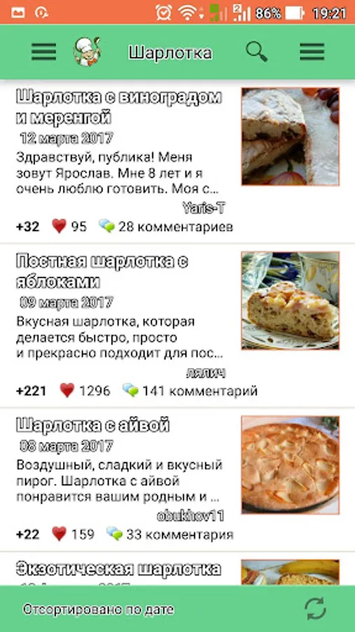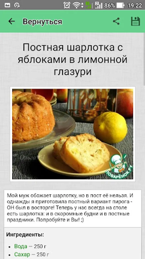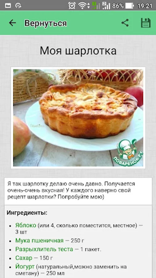 Prepare delicious charlotte with Povarёnok.ru and take away the best recipes to your own cookbook - though they will always be at your fingertips!